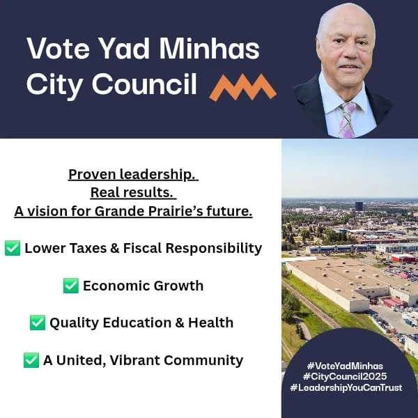 Yad Minhas understands what it means to call Grande Prairie home and has the experience, dedication, and vision to make our city safer, more prosperous, and more accessible for everyone. I strongly encourage all residents to vote for Yad Minhas for Councilor—someone who truly puts Grande Prairie first.